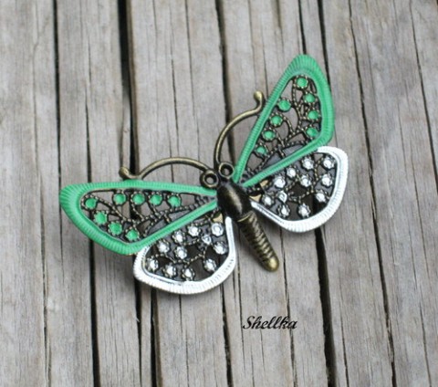 Filigránový motýlek je ručně patinovaný zelenou a stříbrnou patinou na kov.Používám kvalitní patinu.Přilepen brožový můstek.