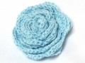 Květina o průměru 5,5 cm uháčkovaná ze světle modré příze. Opatřena je brožovým můstkem.
