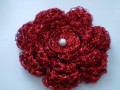 Háčkovaná kytička - brož, z trojitého červeného metalického vlákna o průměru 7,5 cm. Střed tvoří našitá perlička.