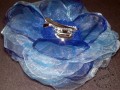 Brož - spona vyrobená z "květinových plátků," bohatý květ poskládaný z tmavě, blankytně, pomněnkově, světle modré a bílé organzy, zdobený korálkem a perleťově bílými pestíky, rozměry: průměr cca 10 cm, výška cca 4 cm.