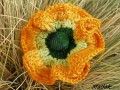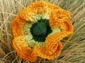 Háčkovaná brož z bavlněné příze s ručně potahovanou butonkou.