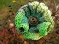 Háčkovaná květinová brož s krásným starobylým kovovým knoflíkem. Melírová příze v zelených odstínech.