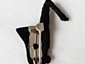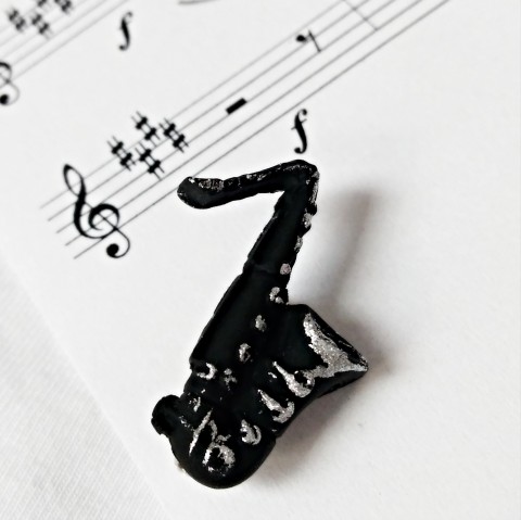 Drobná hudební brož ve tvaru saxofonu vytvořená z černé fimo hmoty. Černé fimo je dozdobeno stříbrným lakem. Výška brože je asi 25 mm. Ze zadí strany je připevněno malé brožové lůžko.