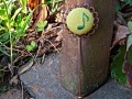 Jehla je v měděném odstínu, v horní ozdobné části je zasazen látkový buttonek o průměru 19 mm, je ze světle zelené látky s vyšívanou osminovou notou. Celková délka brožové jehly je 8 cm.