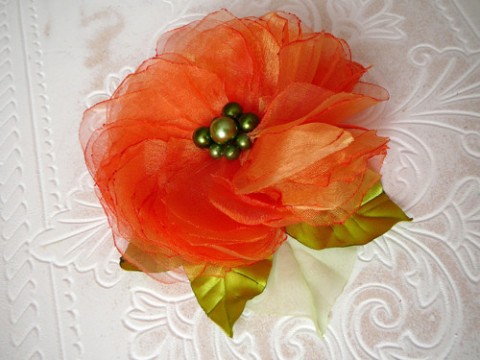 Lehoučká brož, ušitá z organzy + saténové lístečky..