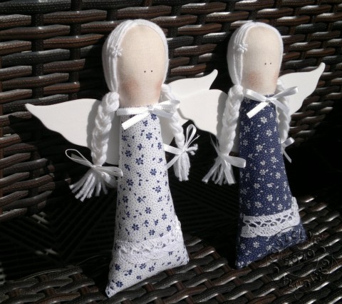 Andělka ušitá z bavlněné látky, plněná dutým vláknem, zdobená krajkou, saténovými kytičkami a stužkou, vlásky z vlněné příze, očka malovaná barvou na textil, křidélka z bílého pěnového papíru moosgummi.