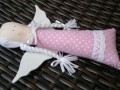 Andělka ušitá z bavlněné látky, plněná dutým vláknem, zdobená krajkou, saténovými kytičkami a stužkou, vlásky z vlněné příze, očka malovaná barvou na textil, křidélka z bílého pěnového papíru moosgummi.