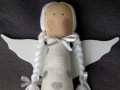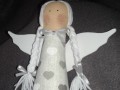 Andělka ušitá ze 100% bavlněné látky světlé šedobéžové barvy s šedými a bílými srdíčky, plněná dutým vláknem, zdobená krajkou, saténovými kytičkami a stužkou, vlásky z vlněné příze (bavlna + akryl) očka malovaná barvou na textil, křidélka z bílého pěnového papíru moosgummi.