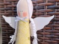 Andělka z jarní kolekce ušitá z bavlněné látky žlutý základ se vzorem bílých kvítečků různých velikostí, plněná dutým vláknem, zdobená krajkou, saténovými kytičkami a stužkou, vlásky z bavlněné příze, očka malovaná barvou na textil, křidélka z bílého pěnového papíru moosgummi.