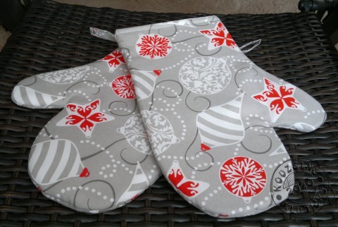 Chňapka ušitá ze 100% bavlněné látky s vánočním vzorem - šedý podklad s potiskem bílých a červených vánočních ozdob, bílá bavlněná podšívka, vyztuženo měkkou, ale silnou výztuhou, opatřená poutkem k zavěšení i silným magnetem.