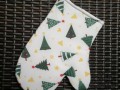 Chňapka ušitá ze 100% bavlněné látky s vánočním vzorem - bílý podklad s vánočními stromečky, bílá bavlněná podšívka, vyztuženo měkkou, ale silnou výztuhou, opatřená poutkem k zavěšení i silným magnetem.