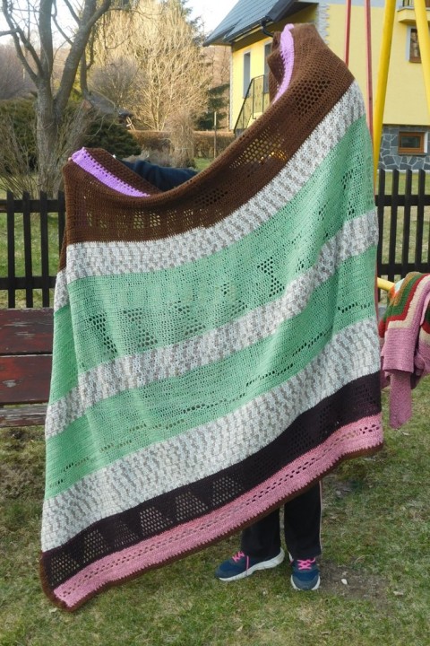 Všechny pletařky to moc dobře znají, tu zůstane kousek, tam zůstane klubíčko a tak se nahromadí nějaké ty větší i menší zbytky. Takto taky vznikla tato háčkovaná deka z rukou mojí maminky. Můžete se do ní zamuchlat a určitě vám bude příjemně teploučko. Můžete položit na trávník a jen tak lenošit. Blíží se jaro a deka se určitě hodí :)