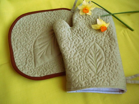 Sada chňapek ušitá z bavlněných látek, strojně prošívaná qiltovaná jemnými vzory. Jedna strana je v barvě khaki, druhá strana je tmavo hnědá viz foto.