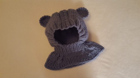 Dětská pletená kukla medvídka se hodí na dítko od 1roku do 2let, má ozdobné ouška a vypletený vzorek. Medvídka lze uplést v jakékoliv barvě. Kuklička je v uni velikosti a dobře se přizpůsobí hlavičce.