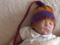Ručně pletená čepice z jemné vlny Vhodná nejen na první focení miminek. Děťátko jí může samozřejmě nosit kdykoliv... Veselá pruhovaná - barevná čepička s maxi copánkem.