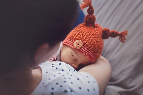 Pletená čepička z oranžovo - rezavé akrylové příze s podílem mohéru, je obháčkována oranžovým lemem. Na lemu má velký dřevěný knoflík pro ozdobu. Čepička má veverčí ouška a je určena hlavně pro atelierové focení miminek. Není to ale jediné využití, naše malá slečna v ni dělá parádu i v kočárku.