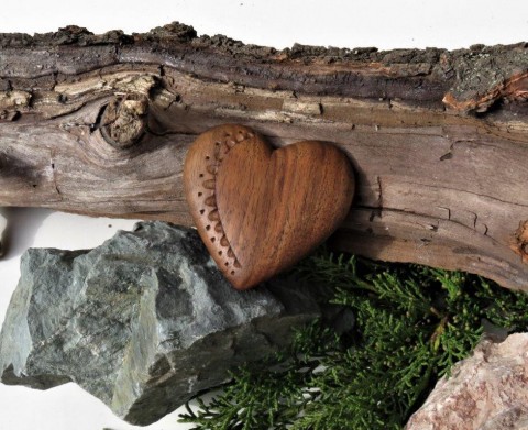 Srdíčko vyřezané a vytvarované z masívního ořechového materiálu, lze použít jako doplněk k dárku, nebo i jako magnetku, je zdobené jemným řezaným ornamentem.