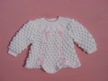 Bílý kabátek je ozdoben mašličkami a protaženou růžovou stužkou, zapínání na 6 malých bílých knoflíčků má na zadním díle.