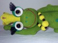 Žabička Tonička vyrostla do výšky cca 52 cm i s korunkou, v sedě cca 36 cm. Je háčkovaná bavlněnou přízí a vyplněná PES kuličkami (antialergenním dutým vláknem). Je to parádnice, proto ji zdobí korále s dřevěnými korálky. Tonička je opatřena bezpečnostními očičky. Ruce a nohy má přišité knoflíky, aby s nimi mohla pohybovat :)