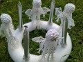 polystyrenový korpus je hustě omotán bílou vlnou a k němu jsou pomocí tavné pistole pletení andílci. Svíčky jsou upevněny na kovových hrotech v korálkových kalíšcích. Průměr věnečku je cca 20cm, andílci jsou vysocí cca 12cm. Jedná se o dekoraci a svíčky nejsou vhodné zapalovat
