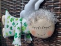 Anděl ušitá z bavlněné látky - bílý podklad s trojlístky - jetelíčkem v různých odstínech zelené, křidélka z bílé látky, plněný dutým vláknem, vlásky z příze, zdobený krajkou, obličej malovaný barvou na textil, opatřený poutkem. Vše je strojně a ručně šité, bez lepení.