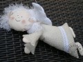 Andělka ušitá z bavlněné látky, křidélka z bílé látky, plněná dutým vláknem, vlásky z příze, zdobené krajkou, stužkou, obličej malovaný barvou na textil, opatřená poutkem. Vše jen strojně a ručně šité, bez lepení.