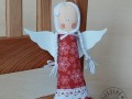Andělka ušitá z bavlněné látky tmavší červené barvy s vločkami různých velikostí, plněná dutým vláknem, zdobená krajkou, vločkou/hvězdičkou a stužkou, vlásky z vlněné příze (vlna + akryl), očka malovaná barvou na textil, křidélka z bílého pěnového papíru moosgummi.