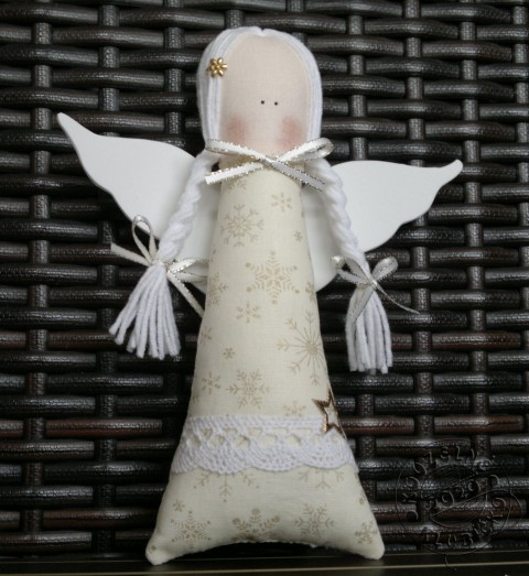 Andělka ušitá z bavlněné látky v barvě SMETANOVÉ se zlatými vločkami - hvězdičkami, plněná dutým vláknem, zdobená krajkou, saténovými kytičkami/hvězdičkami a stužkou, vlásky z vlněné příze (vlna + akryl), očka malovaná barvou na textil, křidélka z bílého pěnového papíru moosgummi.