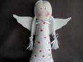 Andělka ušitá z bavlněné látky v barvě bílé se stříbrným vzorem a malými červenými hvězdičkami, plněná dutým vláknem, zdobená krajkou, saténovými kytičkami a stužkou, vlásky z vlněné příze (vlna + akryl), očka malovaná barvou na textil, křidélka z bílého pěnového papíru moosgummi.