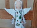 Andělka ušitá z bavlněné látky bílé barvy s zelenými větvičkami a červenými bobulkami, plněná dutým vláknem, zdobená krajkou, vločkou/hvězdičkou a stužkou, vlásky z vlněné příze (vlna + akryl), očka malovaná barvou na textil, křidélka z bílého pěnového papíru moosgummi.