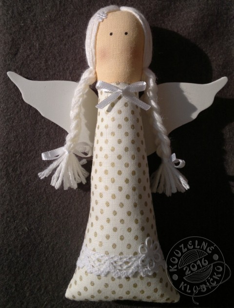 Andělka ušitá z bavlněné látky v barvě jemně smetanové se zlatým vzorem - puntíky, plněná dutým vláknem, zdobená krajkou, saténovými kytičkami a stužkou, vlásky z vlněné příze (vlna + akryl), očka malovaná barvou na textil, křidélka z bílého pěnového papíru moosgummi.