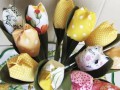 Jarní dekorace šitých tulipánů. Tulipány jsou ušité z bavlněné látky, vyplněné PES kuličkami. Tulipán je upevněn na špejli, která barevně ladí s listy. Velikost tulipánu je cca 28 cm.