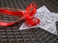 Plochá hvězda motaná z bavlněné příze, silně natužená škrobem, zdobená nádhernými vánočními stuhami, opatřená poutkem. Je vhodné jako dekorace do interiéru, k zavěšení do okna, na dveře.