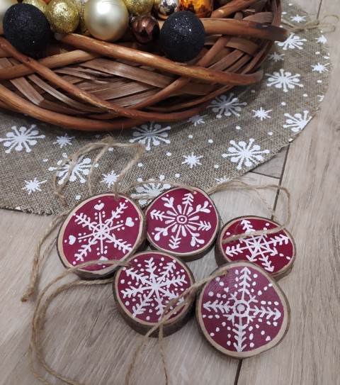 Dřevěné kolečka k zavěšení na stromeček nebo i jinam. Kolečka jsou malovaná akrylovými barvami a zavěšená na jutovém provázku. Kolečka jsou jen lehce opracovaná, zadní strana je také malovaná. Celé kolečko je vždy přelakované bezbarvým lakem. Každé kolečko je originál, nikdy nenajdete dvě stejná.