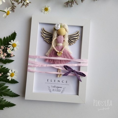 Macramé andělka v rámečku (barva dle přání, uveďte prosím do poznámky v objednávce včetně data a jména)