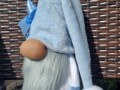 Skřítek má kabátek ušitý z bílého bavlněného úpletu s motivem puntíků (bavlna s příměsí elastanu, gramáž 230g/m2), světlounce modrou čepičku z měkkoučkého fleecu s vysokým chlupem (gramáž 260g/m2) zdobenou mašličkou, světlé modré vousy z umělé kožešiny s dlouhým vlasem (z jejíž ceny se Vám v obchodě protáčejí panenky), rukavičky z filcu, sněhově bílou bambulku z polyesteru, nosík z polyamidu a dutého vlákna.