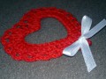 Krajkové srdíčko, háčkované z bavlněné příze v červené barvě, zdobené mašličkou z bílé nebo červené stužky s drobnými bílými puntíky, natuženo škrobem, rozměr cca 8 x 7 cm.