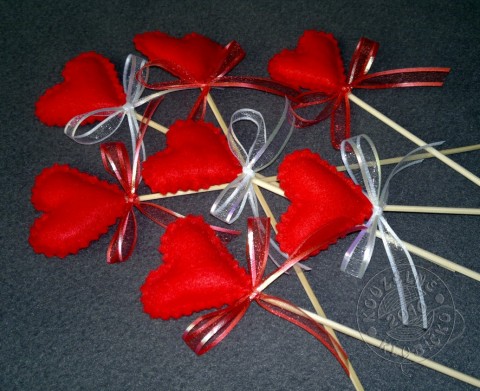 Ručně šité srdíčko z červeného filcu/plsti, plněné dutým vláknem, je připevněné na kvalitní bambusové špejli, ozdobené mašličkou z bílé nebo červené monofilové stužky.