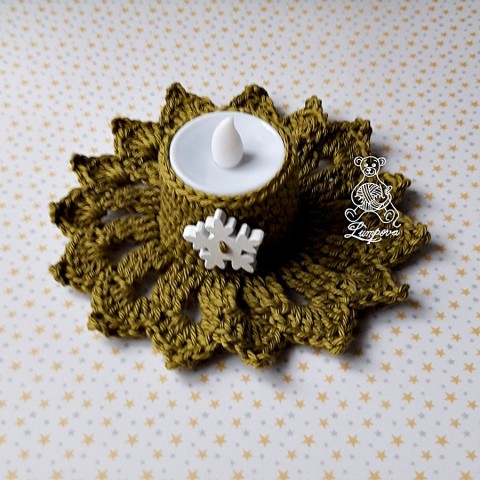 Háčkovaná ozdoba na stůl - vánoční výzdobu, nebo jen jako samotný dáreček. Uvnitř svícínku je bezpečná plastová svíčka na baterii. Nehrozí že by vám svícínek chytnul jako s klasickou svíčkou.