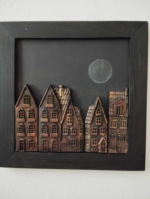 Domečky ve dřevěném rámečku . Odlito z Efkostone , natíráno , patinováno měděným a zlatým voskem .