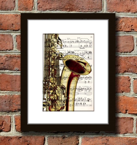 Graficky upravený obrázek saxofonu vytištěný archivačním inkoustem na starém notovém papíře z roku 1900 o rozměru 33 x 21.5 cm.