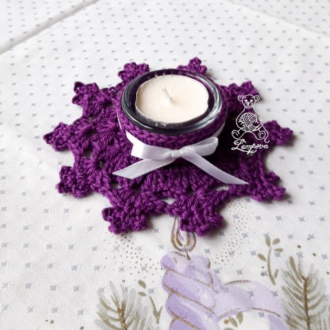 Háčkovaná ozdoba na stůl - vánoční výzdobu, nebo jen jako samotný dáreček. Uvnitř svícínku je skleněný kalíšek na svíčku. Nehrozí že by vám svícínek chytnul. Samozřejmě se nesmí zapálená svíčka bez dozoru.