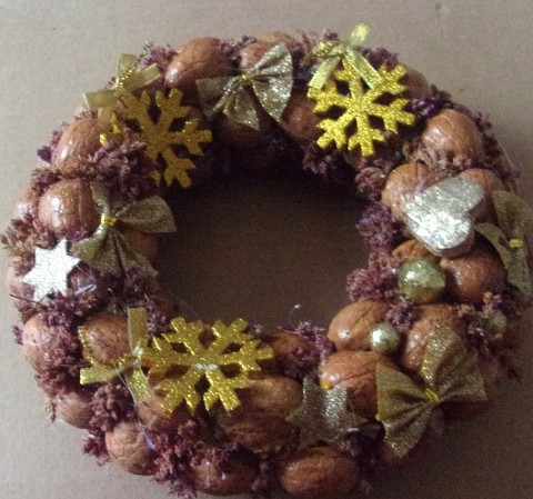 Krásný vánoční věnec byl vytvořen ze skořápek vlašských ořechů. Základem je poylstyrenový kroužek. Věnec je ozdoben zlatým vánočními ozdůbkami a celý je přestříkán zlatou.