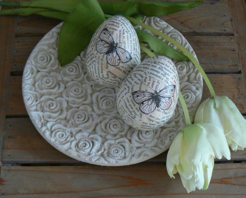 Polystyrénové vajíčko zdobené papírem, zalakované. Vel. 9 cm. Cena za jeden kus.