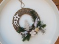 Věnec z kovových prstenců potažených jutou, závěsná boho dekorace o Ø28 cm, zdobená látkovými a umělými rostlinami, dřevěným běleným stromečkem, hvězdami a sušenými plody, dále bavlníkem a skleněnými kouličkami.