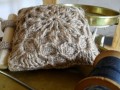 Šitý jutový jehelníček je dozdobený háčkovaným motivem z konopného provázku a zavěšený na lipovém špalíčku.