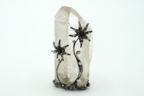 Originální dekorace z křišťálové špice, zdobené drátem a cínem, doplněno korálky granátu. Patinováno, leštěno, ošetřeno antioxidantem.