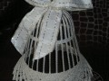 Zvonek motaný z bavlnek v bílé barvě s lesklým, zlatým lurexovým vláknem, silně natužený škrobem, opatřený poutkem na zavěšení, zdobený stužkou.