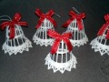 Malý zvonek (6cm) motaný ze 100% bavlněné příze, v bílé barvě, silně natužený škrobem, opatřený poutkem na zavěšení, zdobený rypsovou stužkou v barvě jasně červené s bílým zdobením v krajích.
