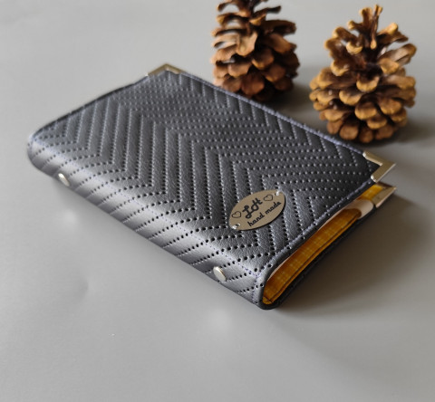 Vnější část karis obalu je ušita z umělé koženky, na vnitřní straně je bavlněná látka. Celý obal je vystužený, opatřen kovovými růžky a gumou proti otevření. Uvnitř se nachází dvě průhledné kapsy, kam je možné vložit poznámky nebo kartičky podle potřeby.